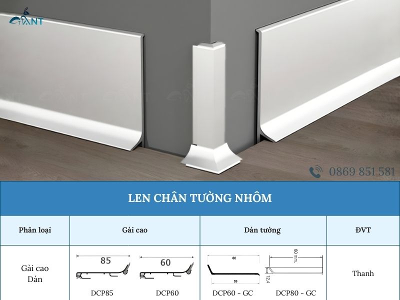 - Các loại phổ biến: Len chân tường gài cao 85mm, len chân tường gài cao 60mm, len chân tường dán 60mm, len chân tường dán 80mm
